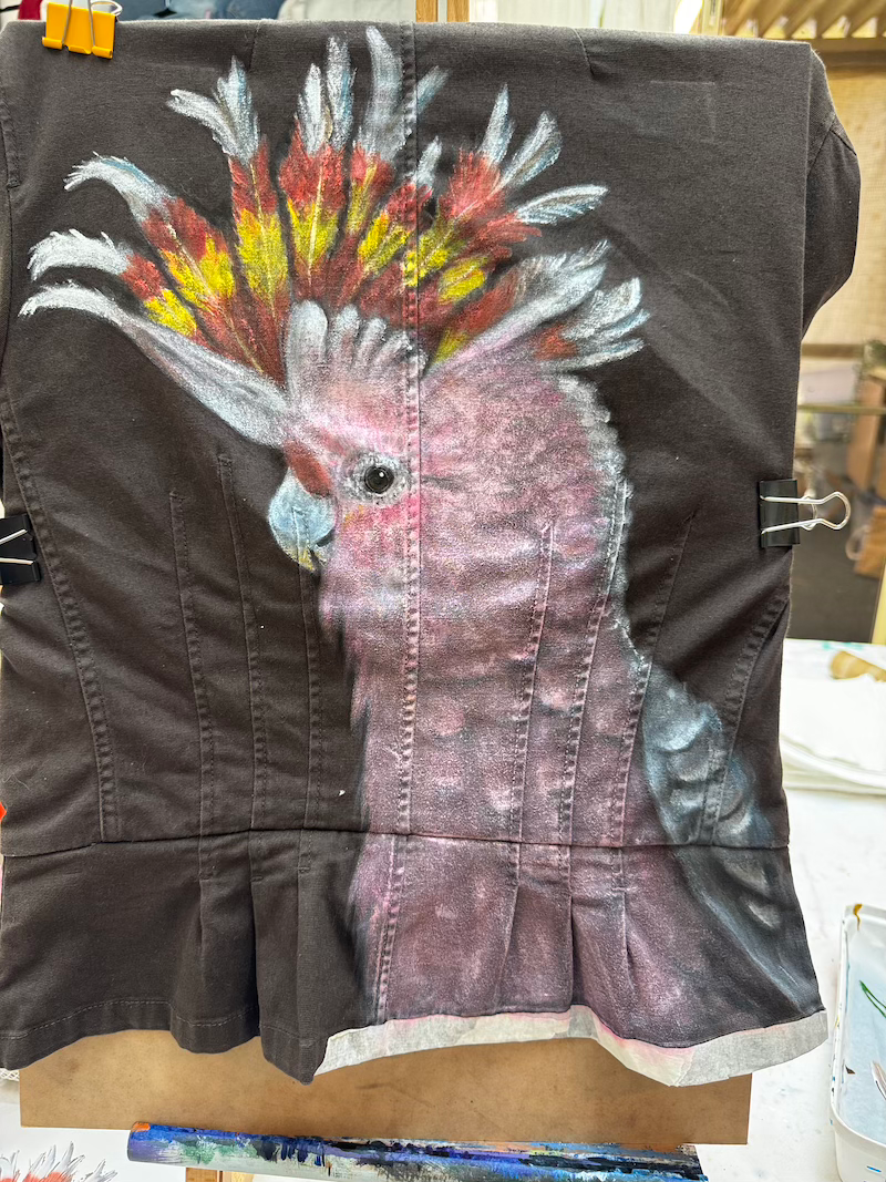 I’ve been painting on fabric since my late teens, and I love the challenge of working with the jacket’s threads, seams, and textures to craft designs that truly stand out. Every jacket is a statement – sustainable, stylish, and designed to brighten your day.